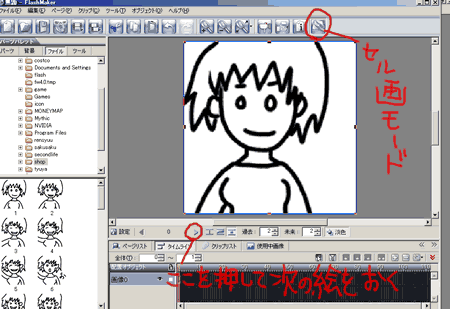 セル画モードボタンをクリックします。一枚目の画像がおけたら下のコマ送りボタンを押してコマを送り、次の絵を置きます。これを絵の数だけ続けます。 |